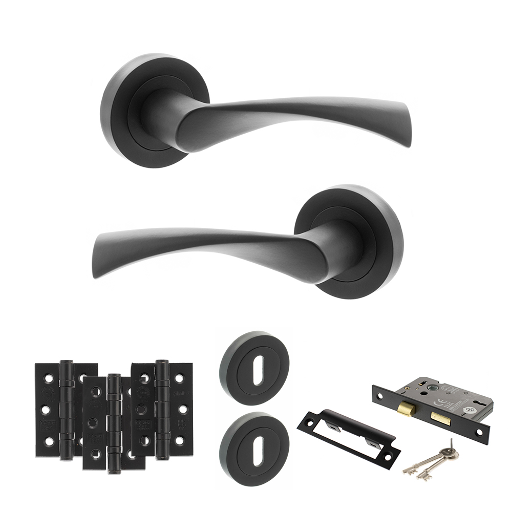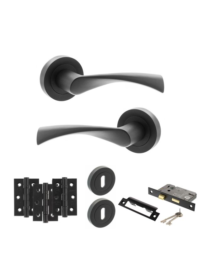 STATUS Colorado Door Handle Pack (3 Lever Lock Set - 3" CE Sashlock, 3" Fire Rated Hinges x3) - Matt Black