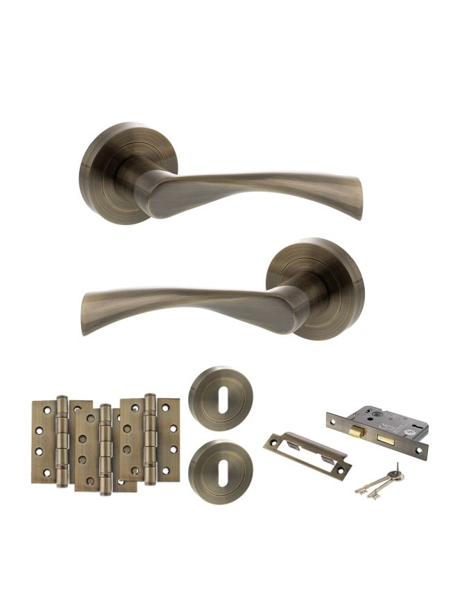 STATUS Colorado Door Handle Pack (3 Lever Lock Set - 3" CE Sashlock, 4" Fire Rated Hinges x3) - Antique Brass