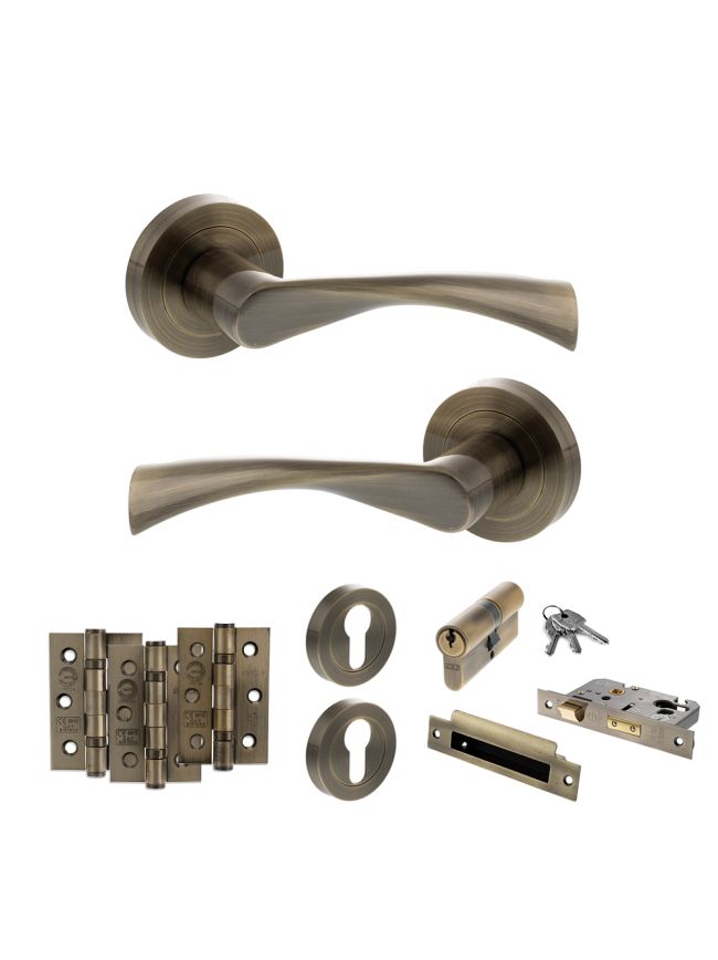 STATUS Colorado Door Handle Pack (Euro Lock Set - 2.5" CE Sashlock, 3" Fire Rated Hinges x3) - Antique Brass