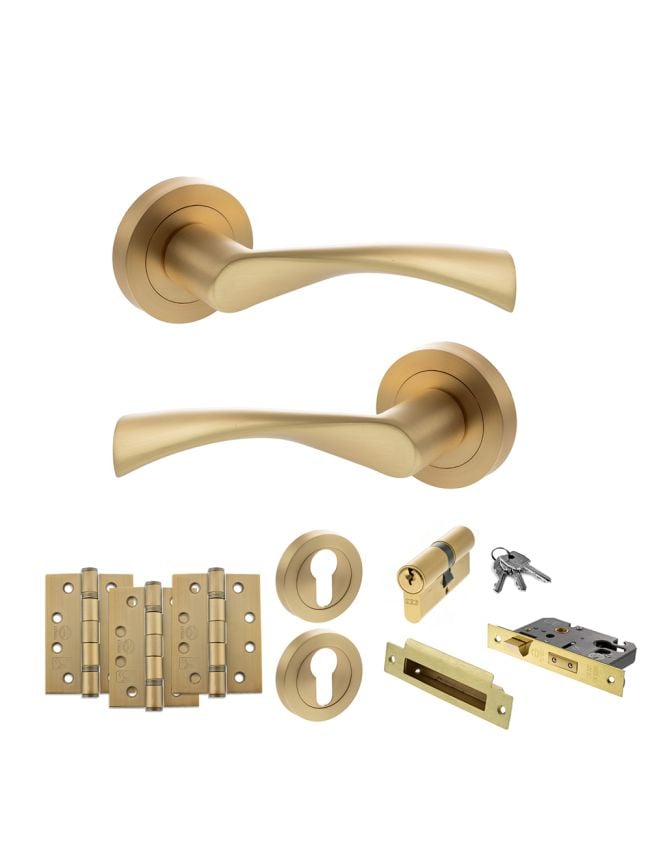 STATUS Colorado Door Handle Pack (Euro Lock Set - 2.5" CE Sashlock, 4" Fire Rated Hinges x3) - Satin Brass
