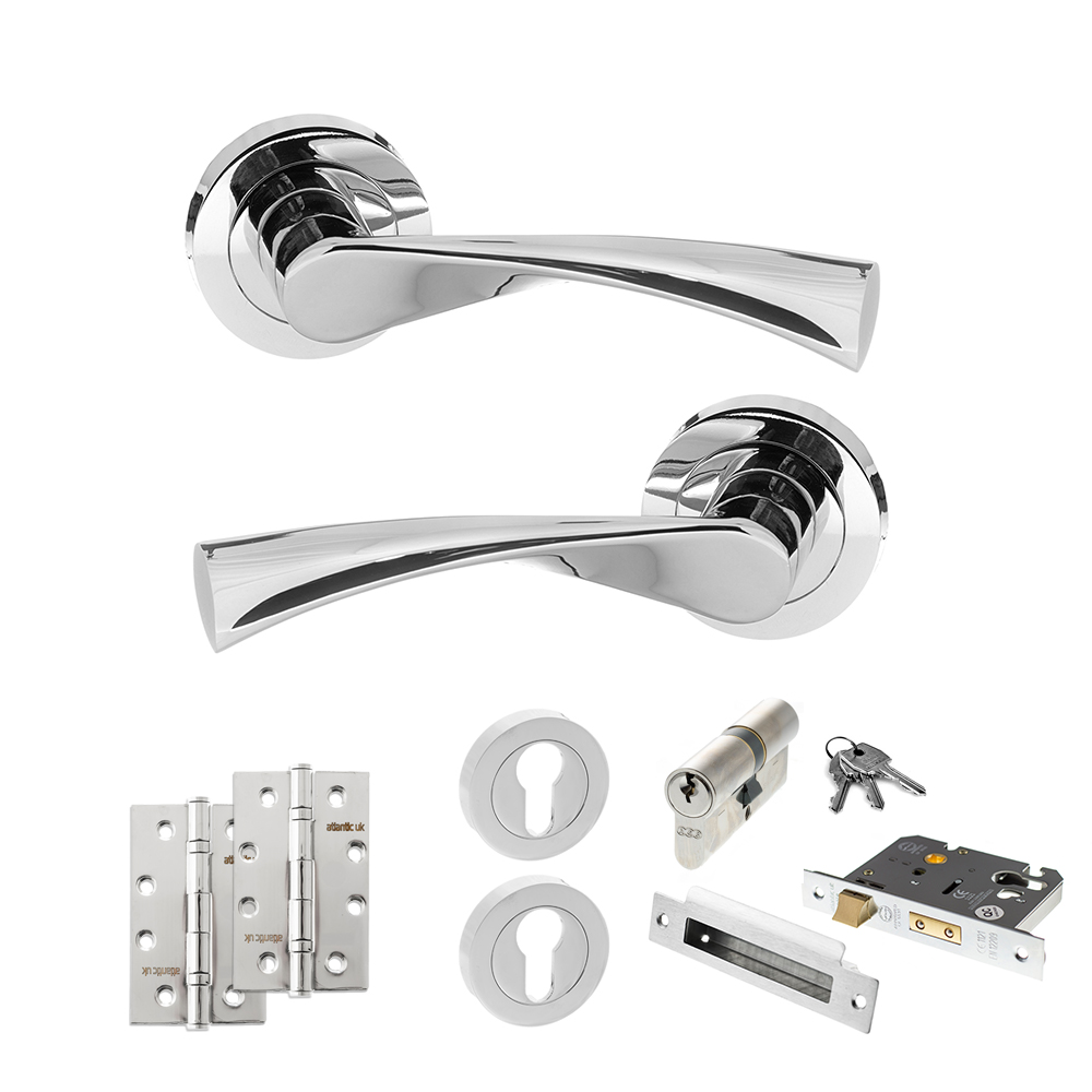 • A high security option for use on internal doors you’d like to lock with a key such as offices or internal porches. It comes with a pair of handles, Euro sashlock, 5 pin Euro cylinder, 3 keys, 2 Euro escutcheons and hinges.