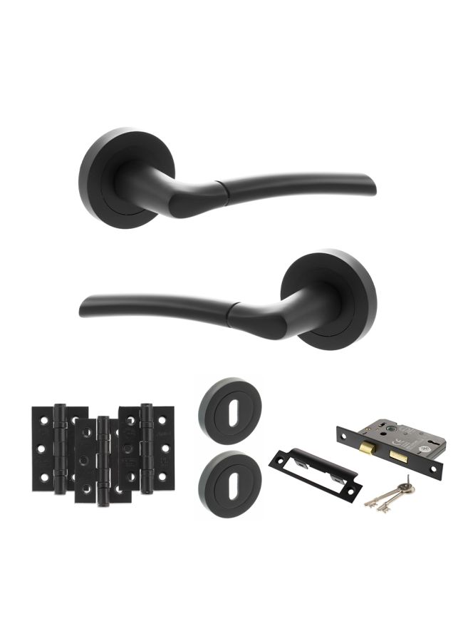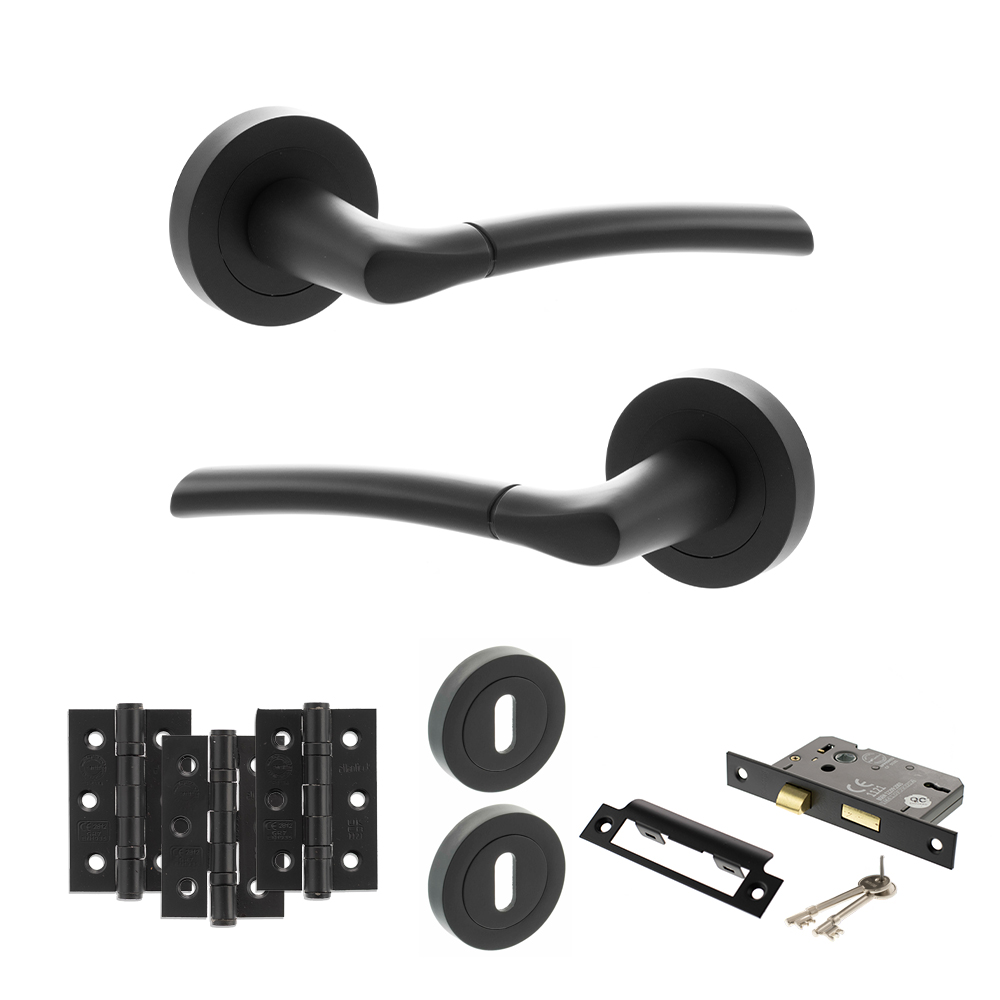 STATUS Indiana Door Handle Pack (3 Lever Lock Set - 3" CE Sashlock, 3" Fire Rated Hinges x3) - Matt Black
