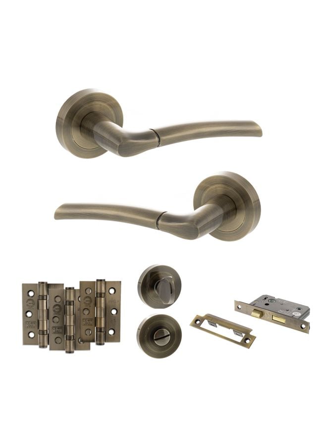 STATUS Indiana Door Handle Pack (Bathroom Set - 3" CE Bathroom Lock, 3" Fire Rated Hinges x3) - Antique Brass