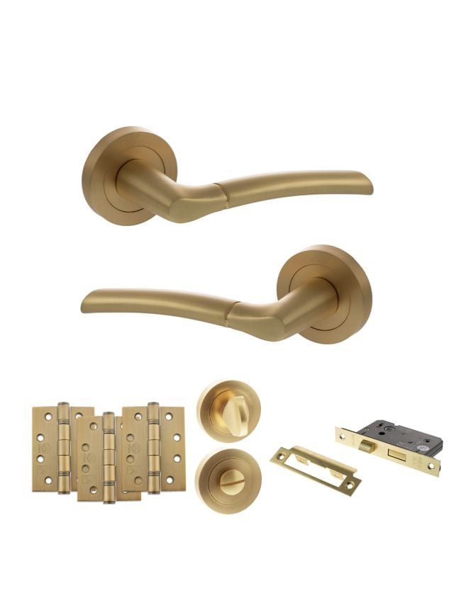 STATUS Indiana Door Handle Pack (Bathroom Set - 3" CE Bathroom Lock, 4" Fire Rated Hinges x3) - Satin Brass