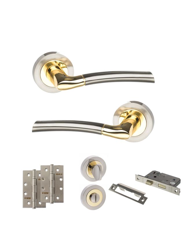 STATUS Indiana Door Handle Pack (Bathroom Set - 3" CE Bathroom Lock, 4" Slim Knuckle Hinges x2) - Satin Nickel/Polished Brass