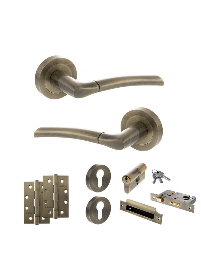 STATUS Indiana Door Handle Pack (Euro Lock Set - 2.5" CE Sashlock, 4" Slim Knuckle Hinges x2) - Antique Brass