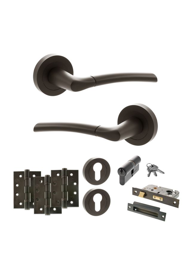 STATUS Indiana Door Handle Pack (Euro Lock Set - 3" CE Sashlock, 4" Fire Rated Hinges x3) - Urban Dark Bronze