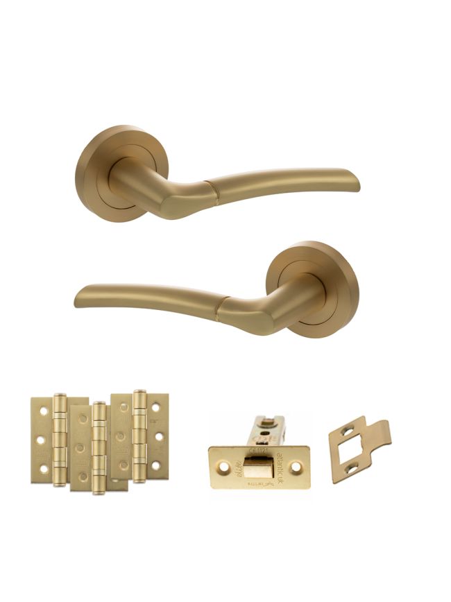 STATUS Indiana Door Handle Pack (Latch Set - 2.5" CE Latch, 3" Fire Rated Hinges x3) - Satin Brass