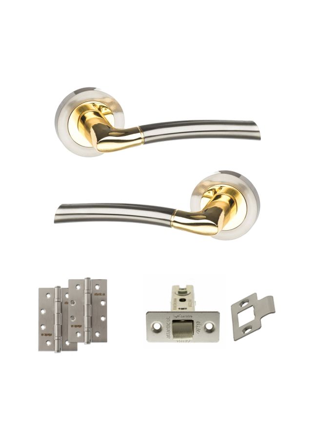 STATUS Indiana Door Handle Pack (Latch Set - 2.5" CE Latch, 4" Slim Knuckle Hinges x2) - Satin Nickel/Polished Brass