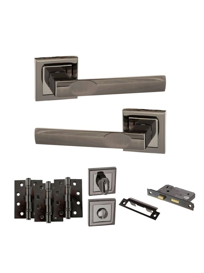STATUS Kansas Door Handle Pack (Bathroom Set - 3" CE Bathroom Lock, 4" Fire Rated Hinges x3) - Black Nickel