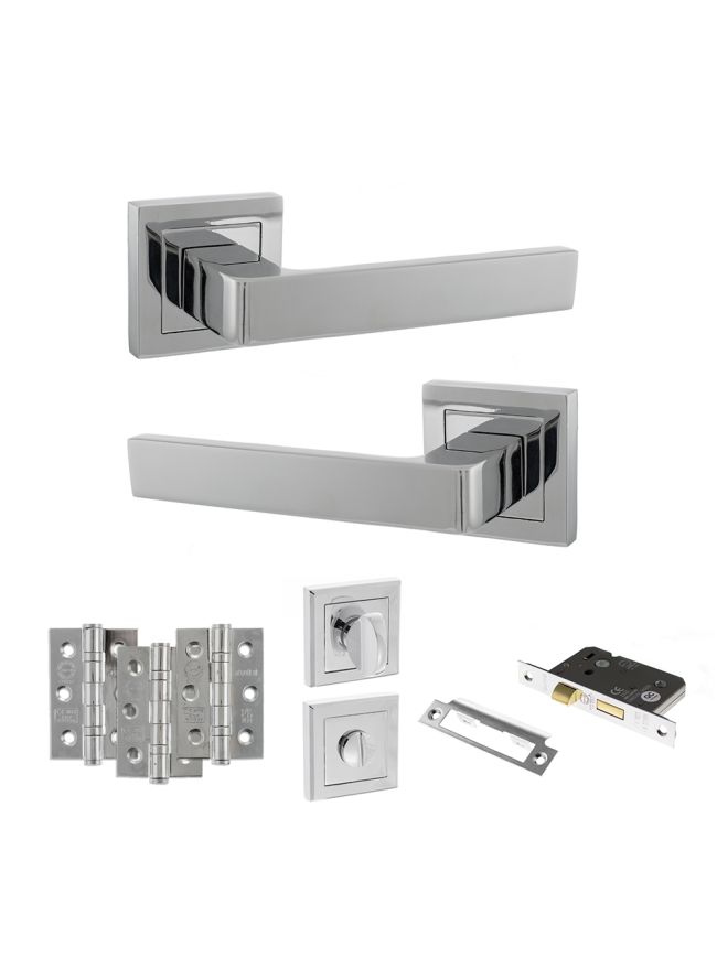 STATUS Montana Door Handle Pack (Bathroom Set - 2.5" CE Bathroom Lock, 3" Fire Rated Hinges x3) - Polished Chrome