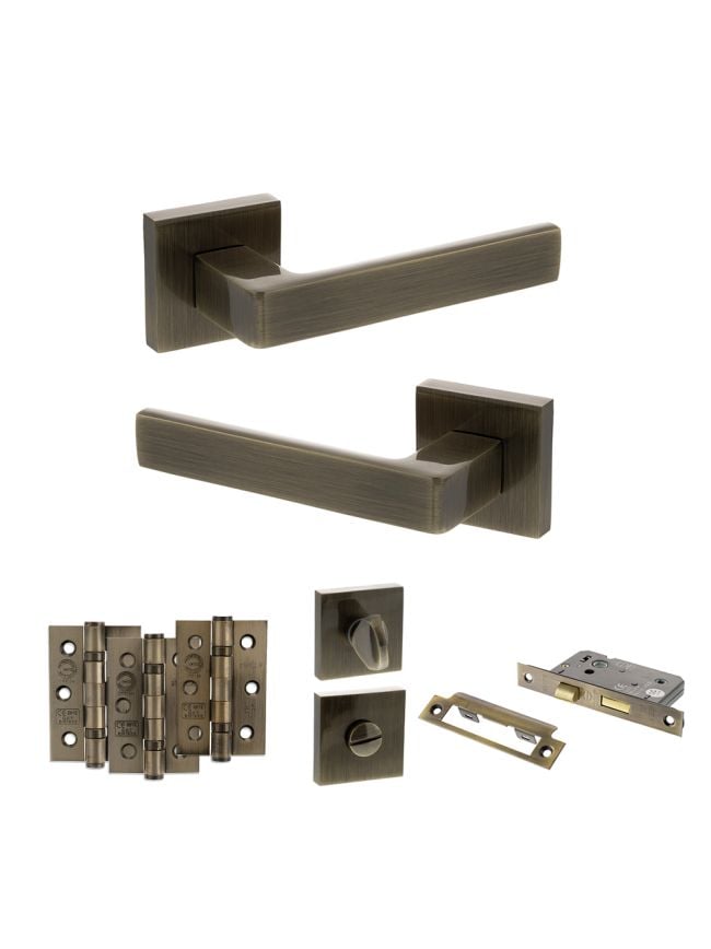 STATUS Montana Door Handle Pack (Bathroom Set - 3" CE Bathroom Lock, 3" Fire Rated Hinges x3) - Antique Brass