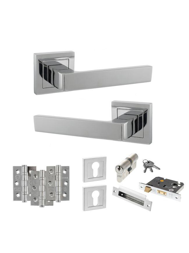 STATUS Montana Door Handle Pack (Euro Lock Set - 3" CE Sashlock, 3" Fire Rated Hinges x3) - Polished Chrome