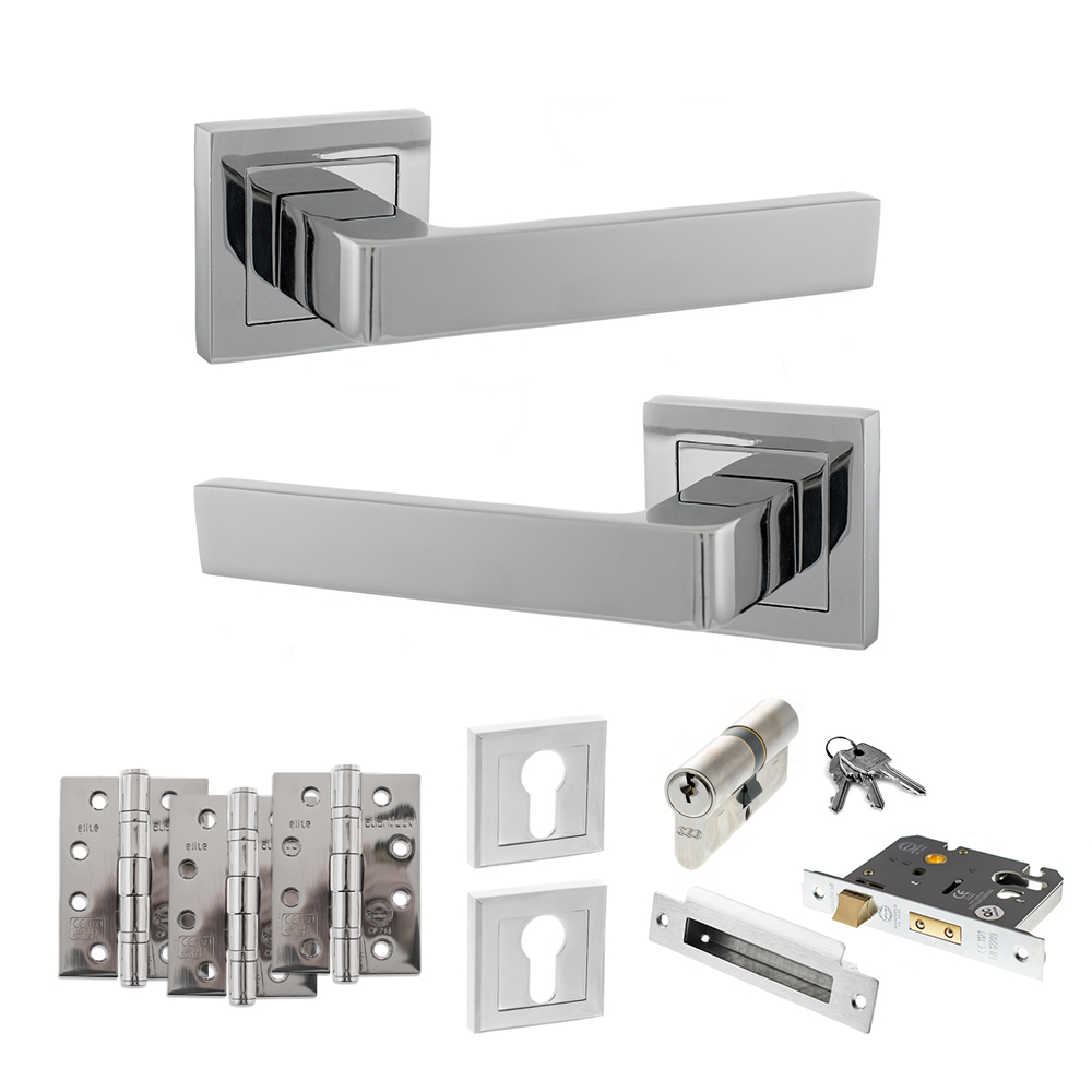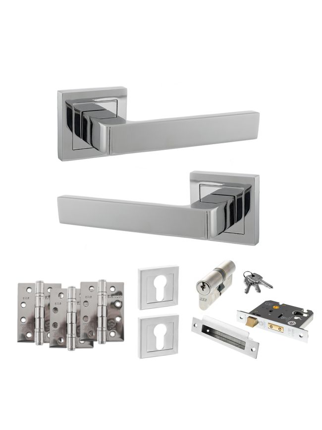 STATUS Montana Door Handle Pack (Euro Lock Set - 3" CE Sashlock, 4" Fire Rated Hinges x3) - Polished Chrome