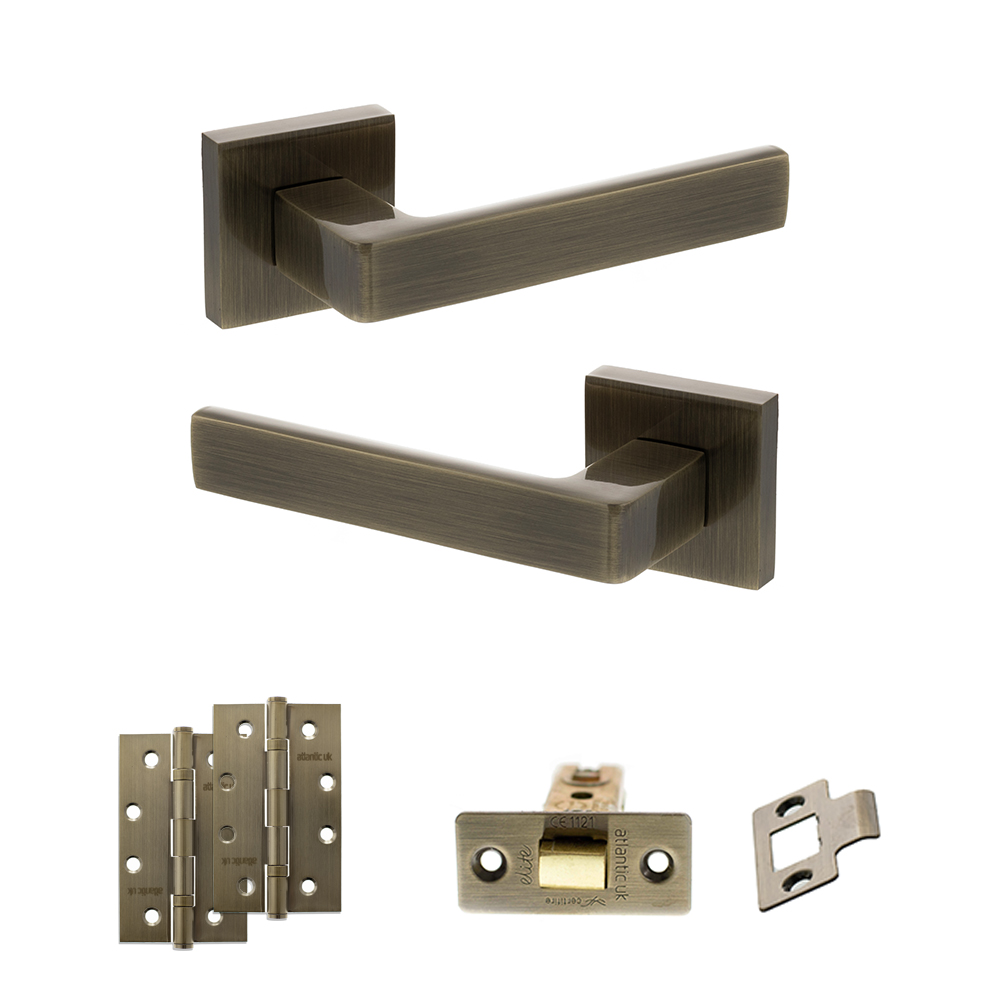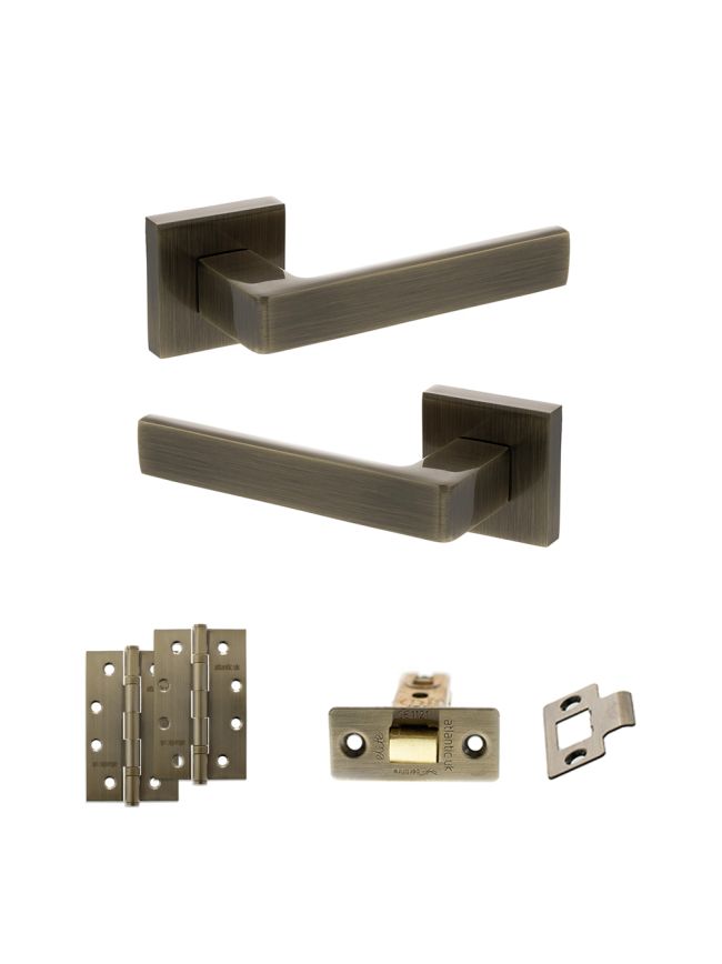 STATUS Montana Door Handle Pack (Latch Set - 2.5" CE Latch, 4" Slim Knuckle Hinges x2) - Antique Brass