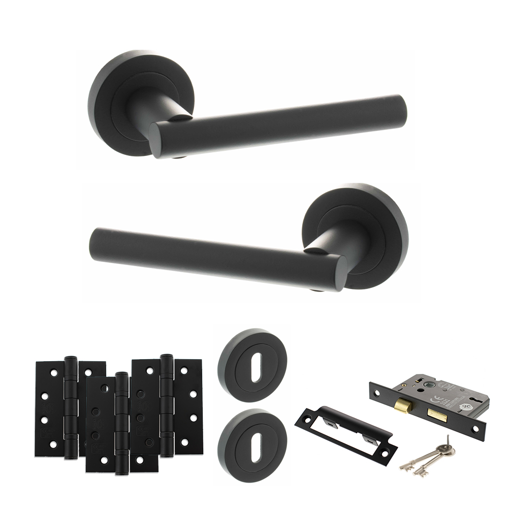 STATUS Nebraska Door Handle Pack (3 Lever Lock Set - 2.5" CE Sashlock, 4" Fire Rated Hinges x3) - Matt Black