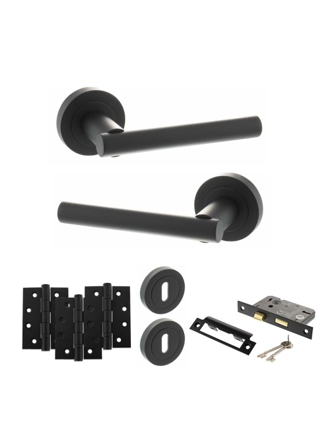 STATUS Nebraska Door Handle Pack (3 Lever Lock Set - 3" CE Sashlock, 4" Fire Rated Hinges x3) - Matt Black