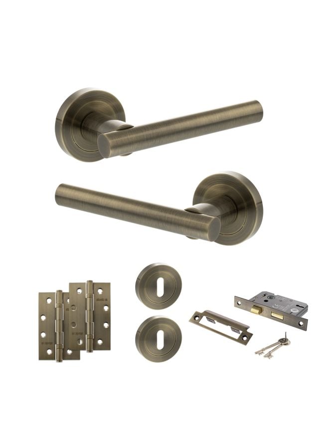 STATUS Nebraska Door Handle Pack (3 Lever Lock Set - 3" CE Sashlock, 4" Slim Knuckle Hinges x2) - Antique Brass