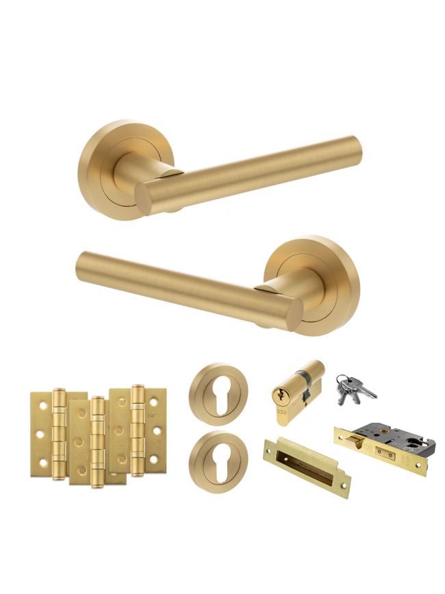 STATUS Nebraska Door Handle Pack (Euro Lock Set - 2.5" CE Sashlock, 3" Fire Rated Hinges x3) - Satin Brass