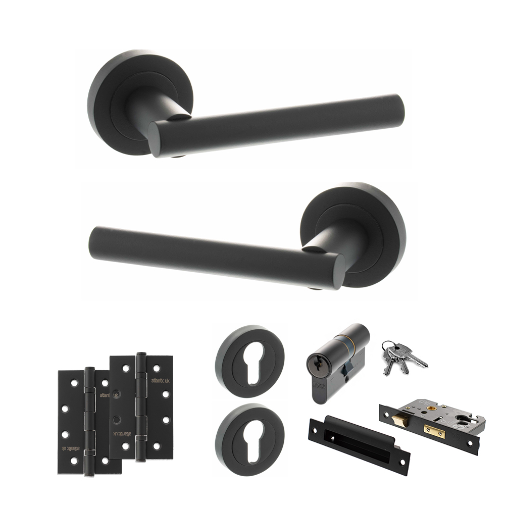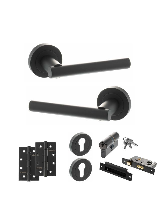 STATUS Nebraska Door Handle Pack (Euro Lock Set - 2.5" CE Sashlock, 4" Slim Knuckle Hinges x2) - Matt Black