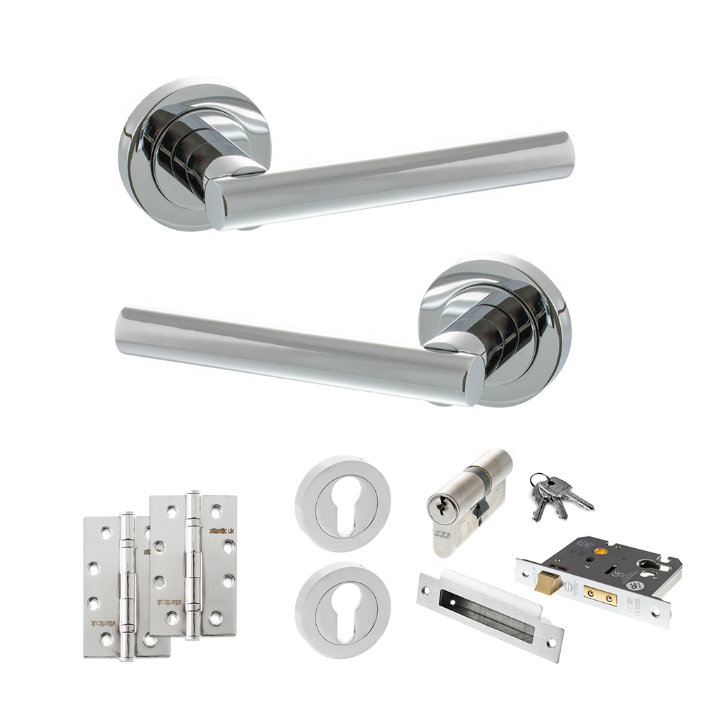 • A high security option for use on internal doors you’d like to lock with a key such as offices or internal porches. It comes with a pair of handles, Euro sashlock, 5 pin Euro cylinder, 3 keys, 2 Euro escutcheons and hinges.