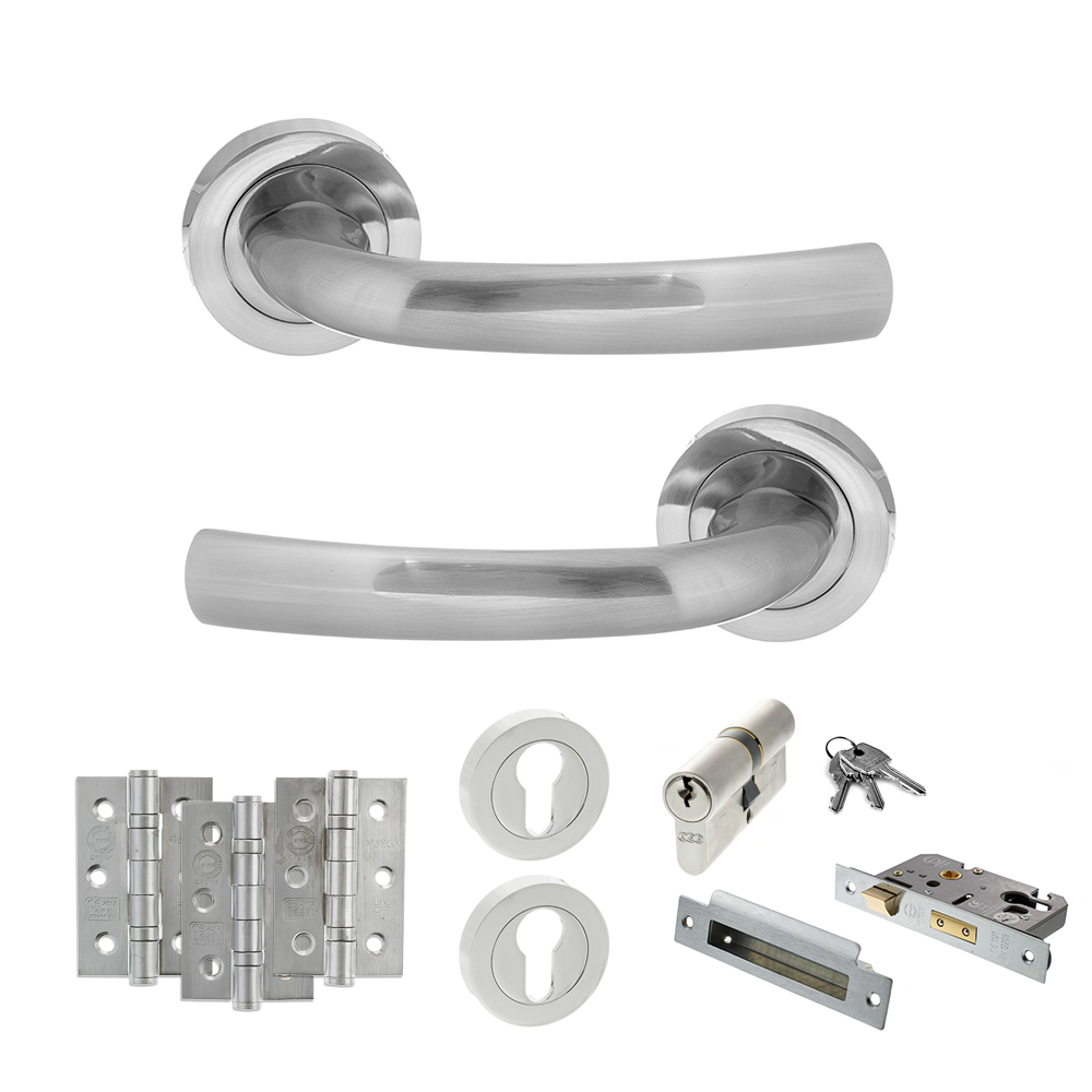 STATUS Nevada Door Handle Pack (Euro Lock Set - 3" CE Sashlock, 3" Fire Rated Hinges x3) - Satin Chrome
