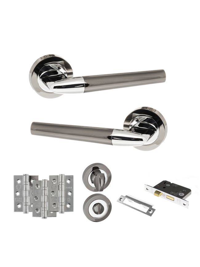STATUS Tennessee Door Handle Pack (Bathroom Set - 3" CE Bathroom Lock, 3" Fire Rated Hinges x3) - Black Nickel/Polished Chrome