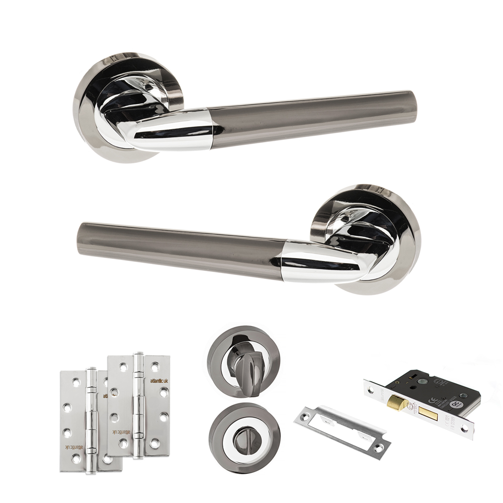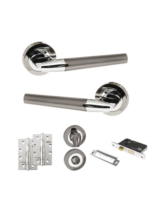 STATUS Tennessee Door Handle Pack (Bathroom Set - 3" CE Bathroom Lock, 4" Slim Knuckle Hinges x2) - Black Nickel/Polished Chrome