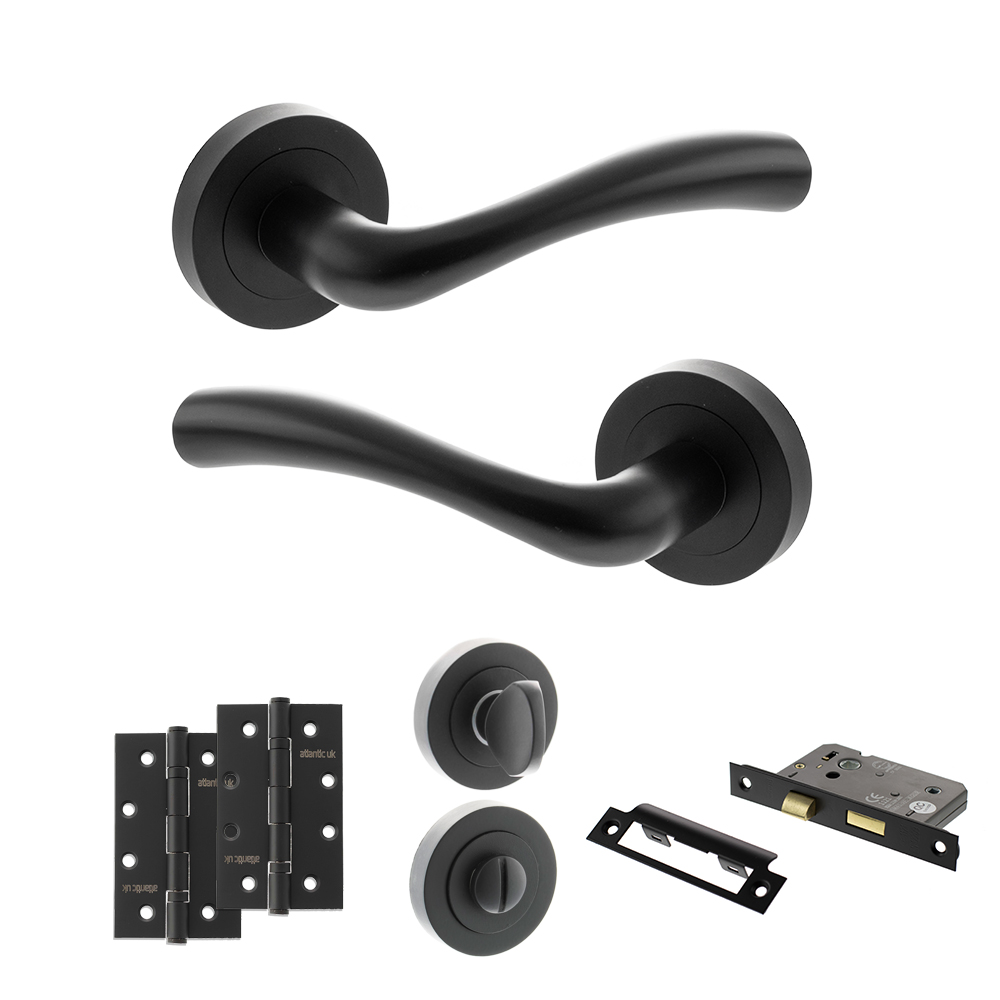 • For use on a toilet or bathroom door, this pack comes with a pair of handles, bathroom lock, turn & release and hinges.