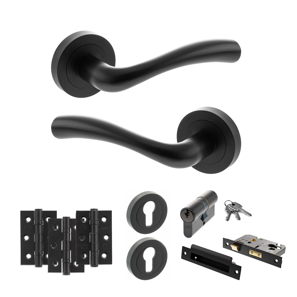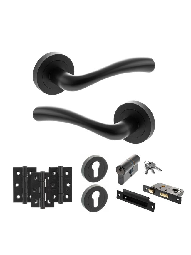 STATUS Texas Door Handle Pack (Euro Lock Set - 3" CE Sashlock, 3" Fire Rated Hinges x3) - Matt Black