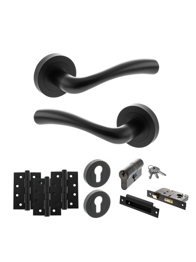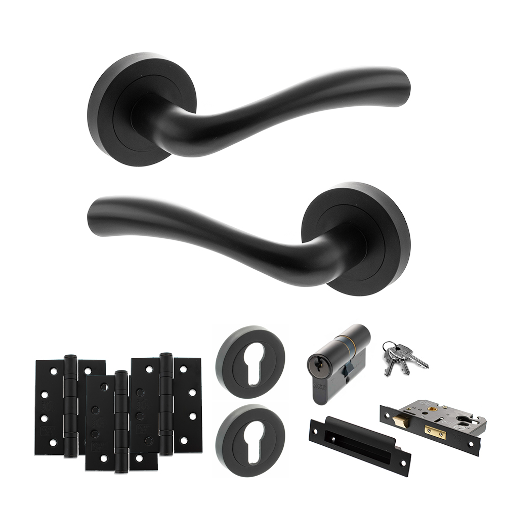 STATUS Texas Door Handle Pack (Euro Lock Set - 3" CE Sashlock, 4" Fire Rated Hinges x3) - Matt Black