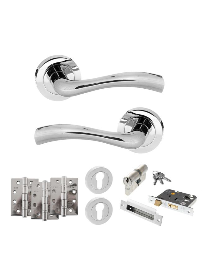 STATUS Texas Door Handle Pack (Euro Lock Set - 3" CE Sashlock, 4" Fire Rated Hinges x3) - Polished Chrome