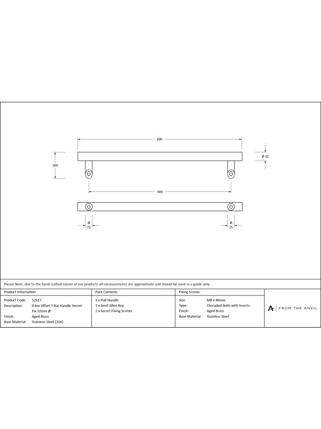 Aged Brass (316) 0.6m Offset T Bar Handle Secret Fix 32mm Ø