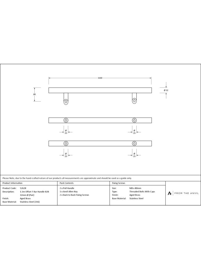 Aged Brass (316) 1.5m Offset T Bar Handle B2B 32mm Ø