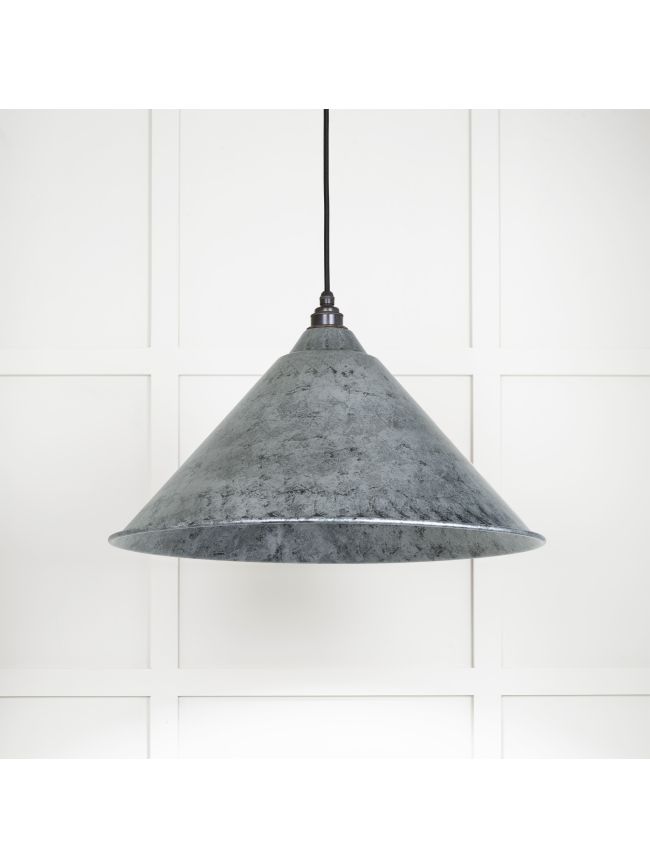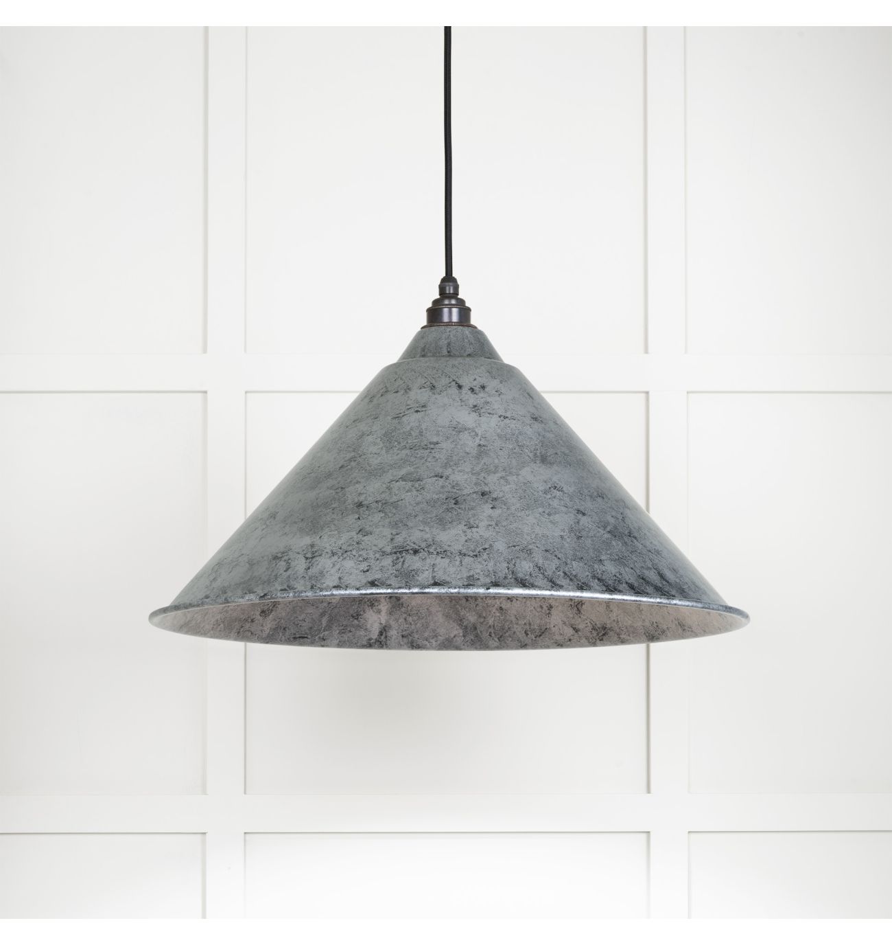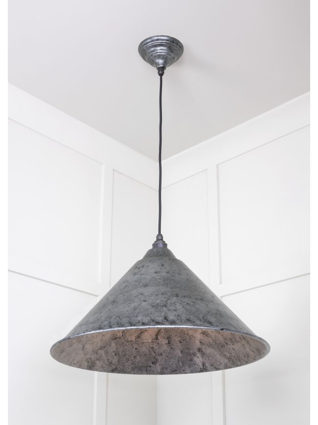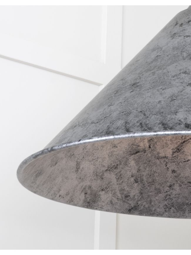Hand spun from solid brass and powder coated with a bespoke pewter finish, a black glaze is applied to the Pewter lights before being carefully rubbed back by hand, selectively removing it from raised areas while leaving it in the recessed and textured areas creating contrast and depth. The artisanal nature of this manufacturing tecnique means each piece is entirely unique.