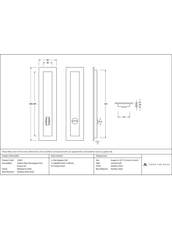 Polished Marine SS (316) 250mm Plain Rectangular Pull - Privacy Set
