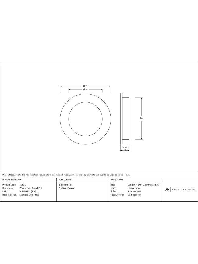 Polished Marine SS (316) 75mm Plain Round Pull