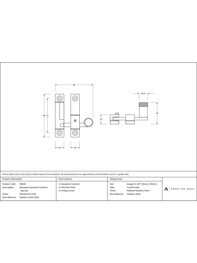Polished Marine SS (316) Brompton Quadrant Fastener - Narrow