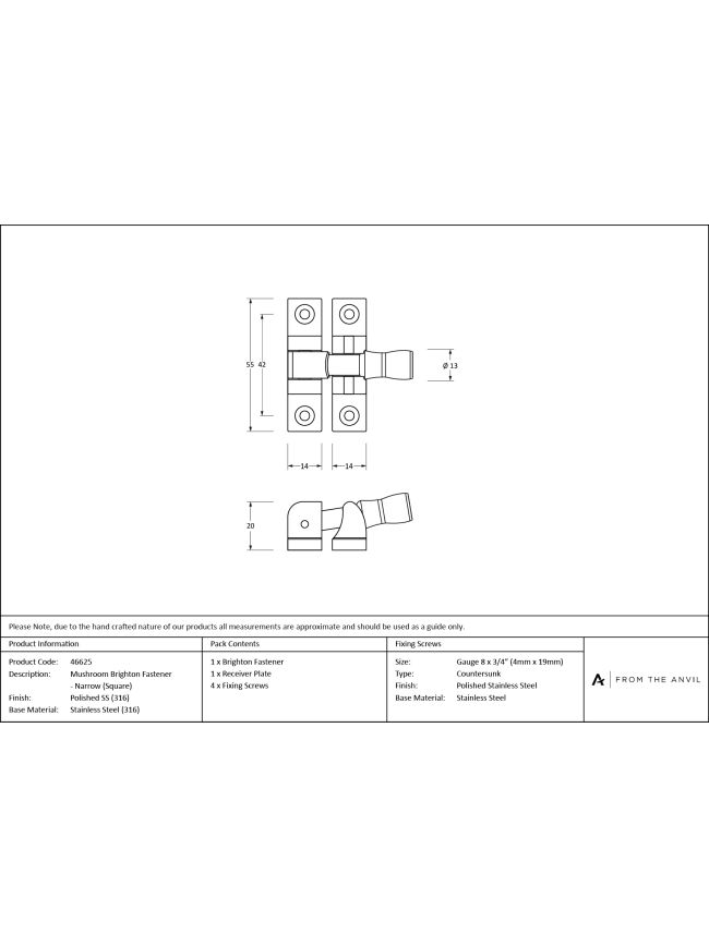 Polished Marine SS (316) Mushroom Brighton Fastener - Narrow (Square)