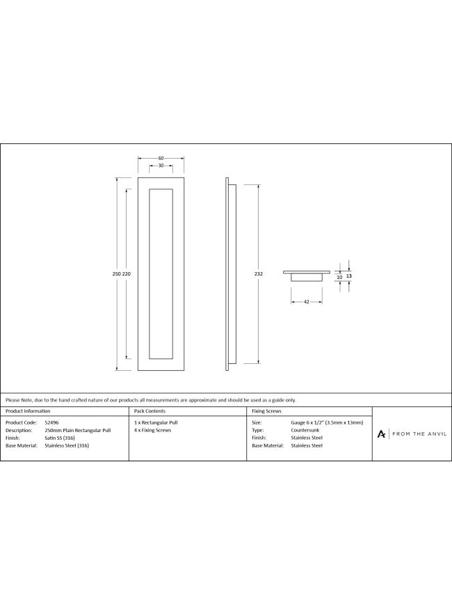 Satin Marine SS (316) 250mm Plain Rectangular Pull