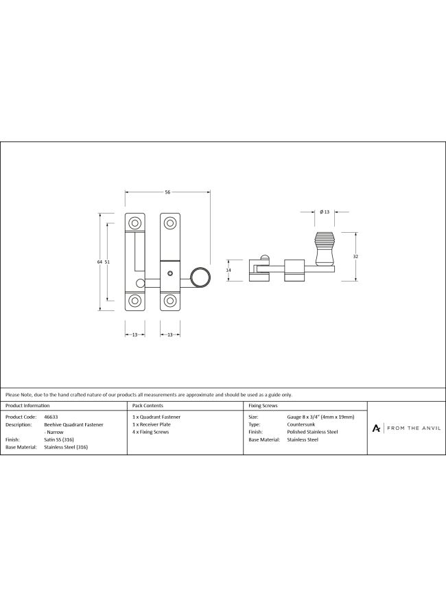 Satin Marine SS (316) Beehive Quadrant Fastener - Narrow