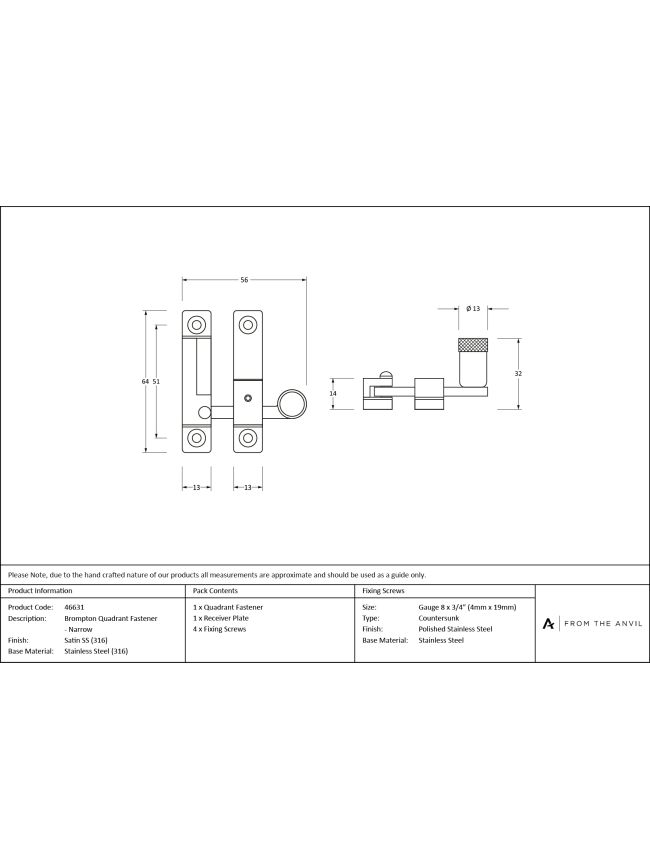 Satin Marine SS (316) Brompton Quadrant Fastener - Narrow