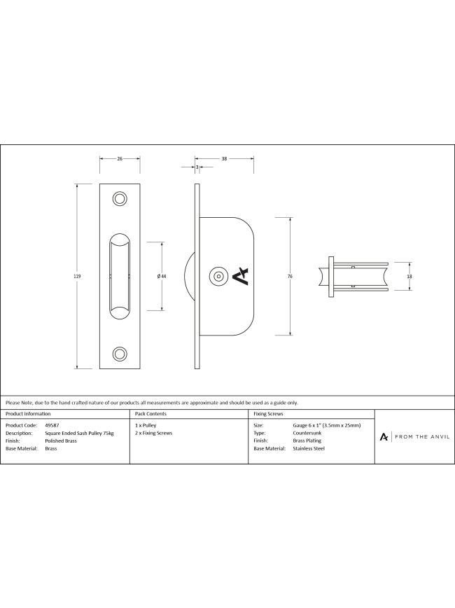 Unlacquered Brass Square Ended Sash Pulley 75kg