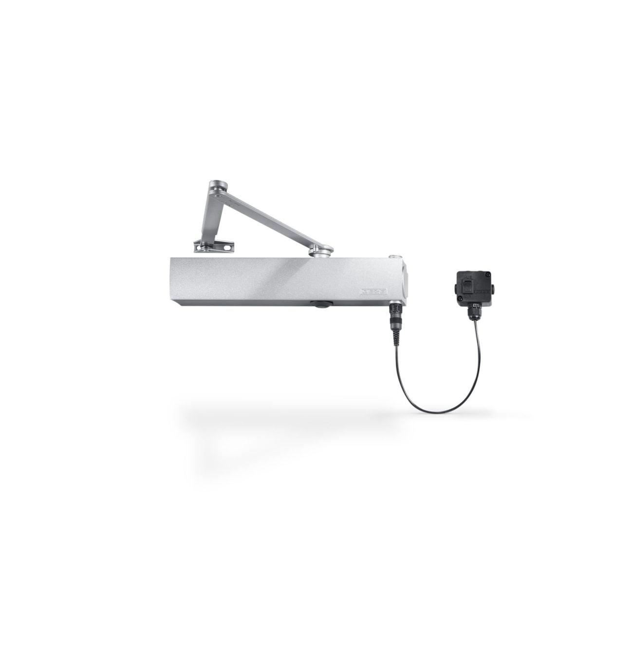 TS 4000 E Overhead door closer with link arm for single leaf doors of up to 1400 mm leaf width with electric hold-open device.