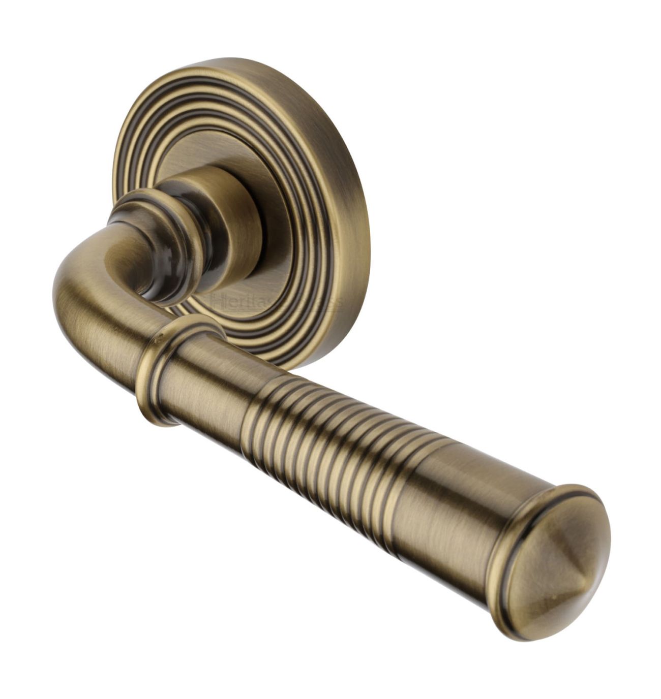 Heritage Brass Door Handle Lever Latch on Round Rose Bridgetown Reeded Design Antique Brass finish UK Registered Design Number 6226297