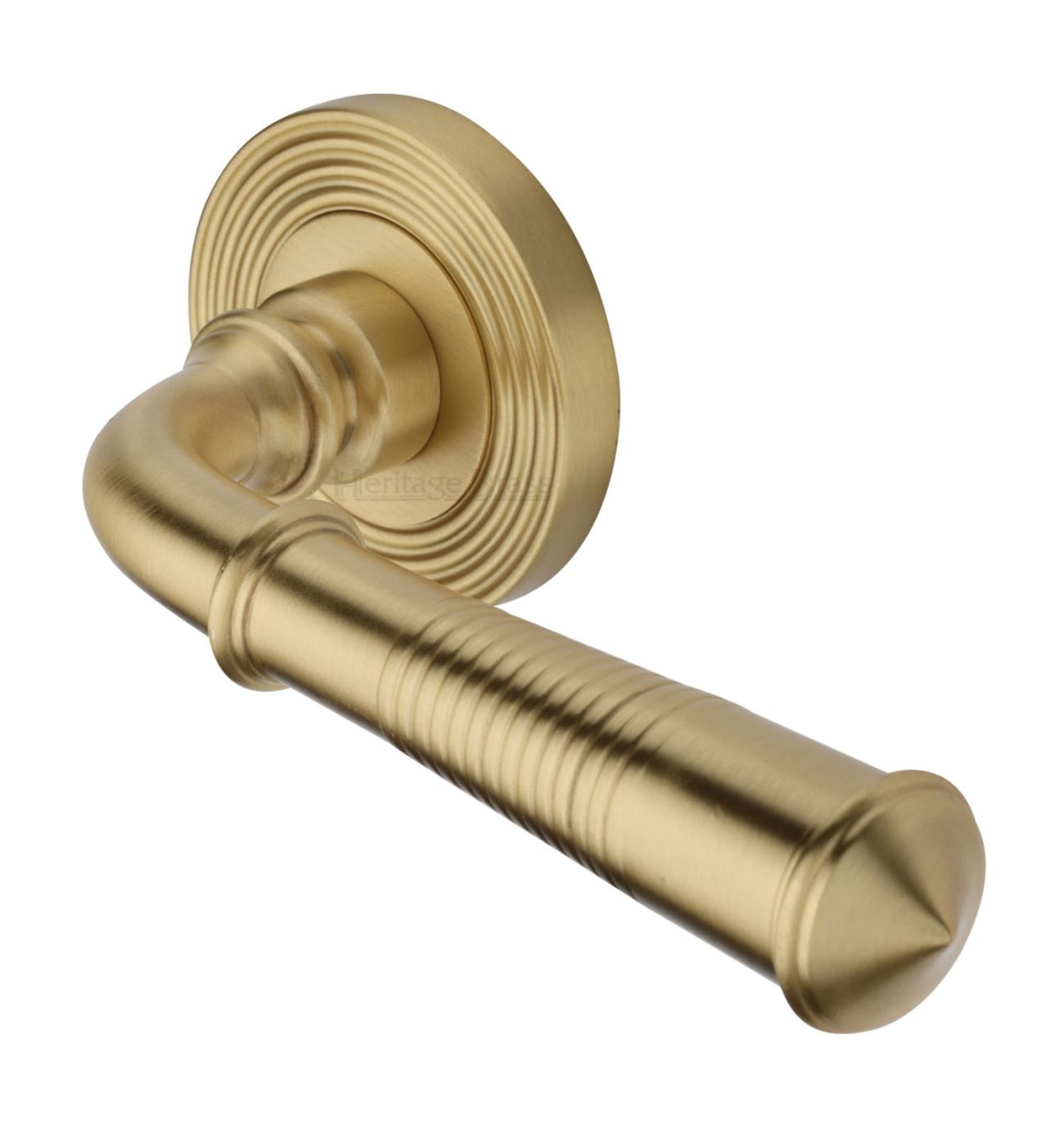 Heritage Brass Door Handle Lever Latch on Round Rose Bridgetown Reeded Design Satin Brass finish UK Registered Design Number 6226297
