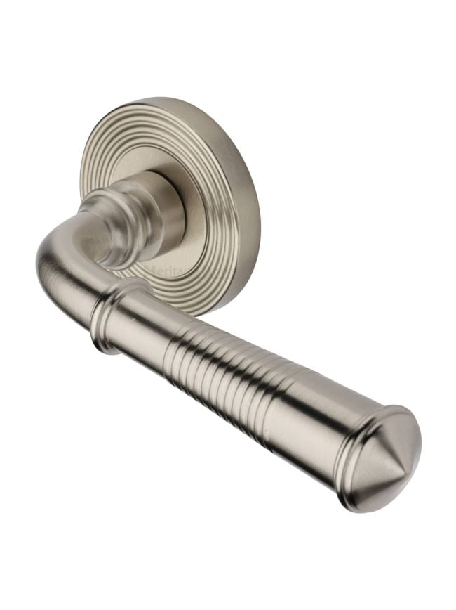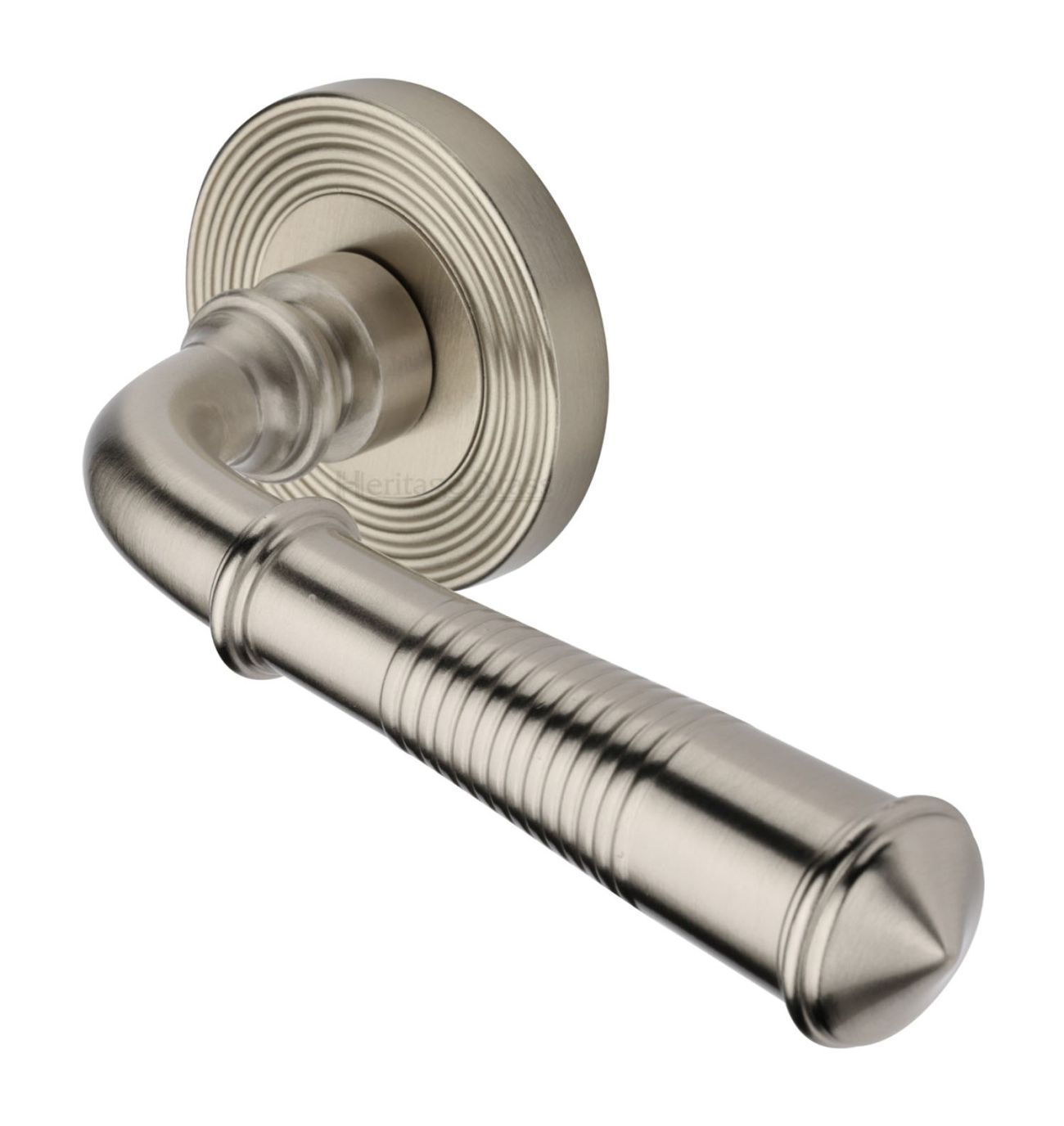 Heritage Brass Door Handle Lever Latch on Round Rose Bridgetown Reeded Design Satin Nickel finish UK Registered Design Number 6226297