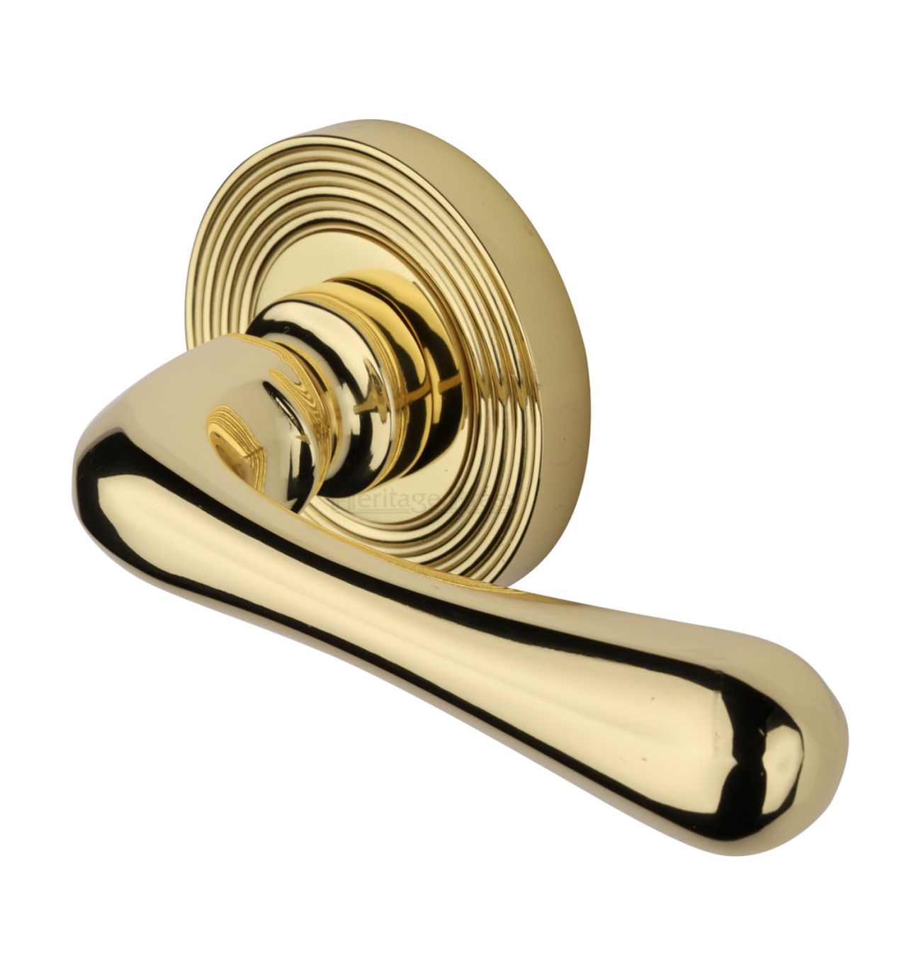 Heritage Brass Door Handle Lever Latch on Round Rose Charlbury Reeded Design Polished Brass finish UK Registered Design Number 6226298