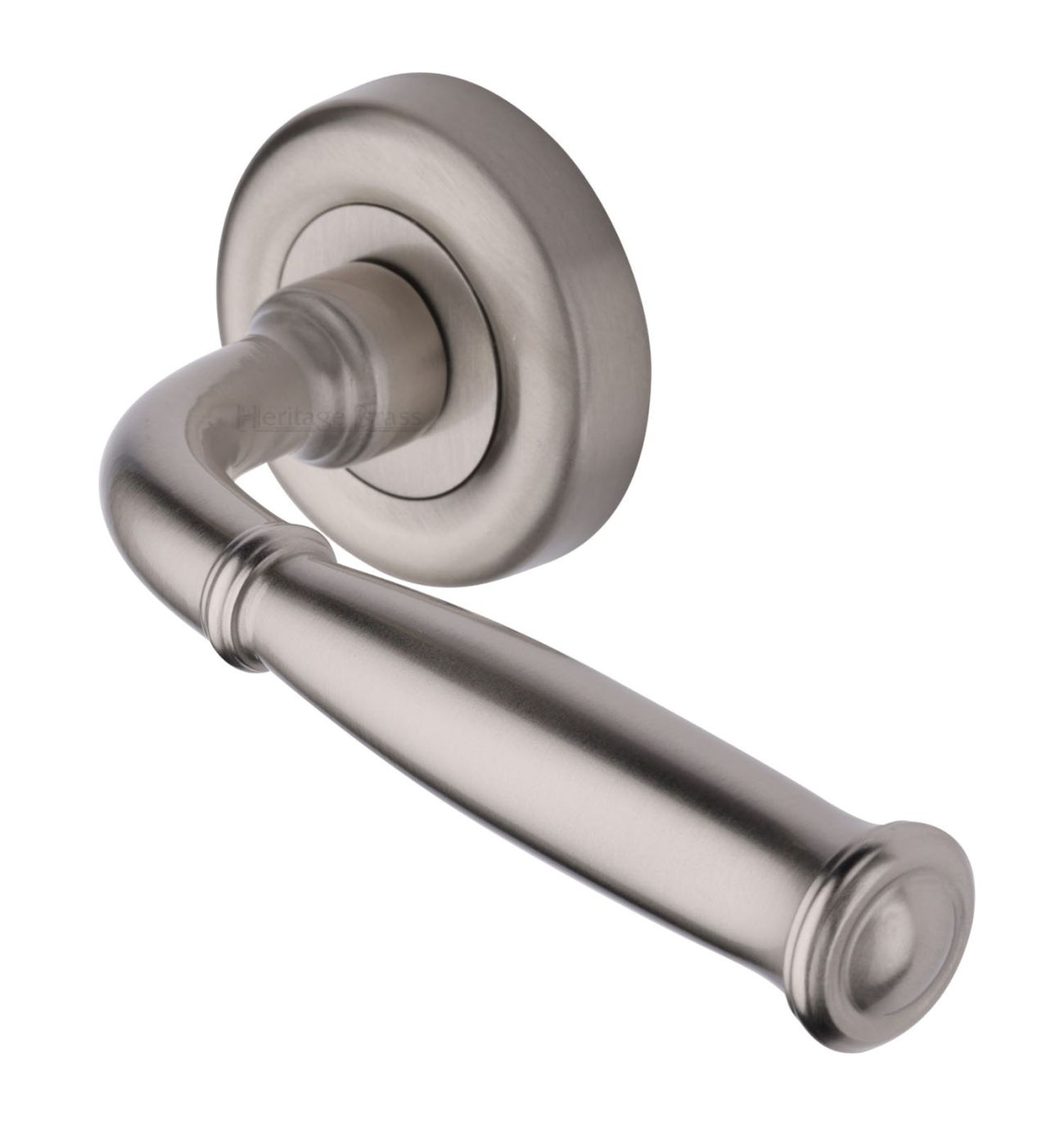 Heritage Brass Door Handle Lever Latch on Round Rose Lincoln Design Satin Nickel finish UK Registered Design Number 6228268