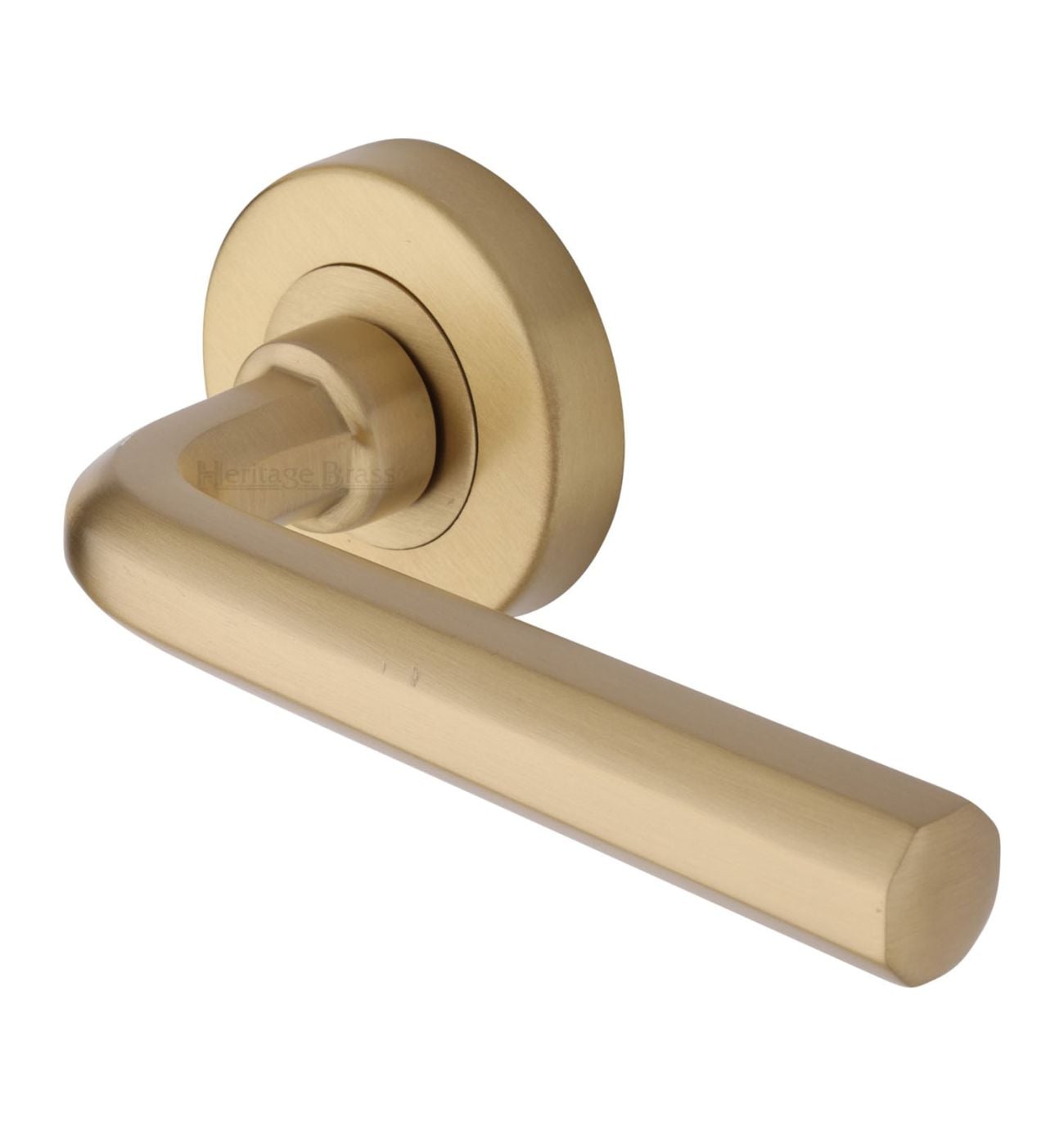 Heritage Brass Door Handle Lever Latch on Round Rose Octave Design Satin Brass finish UK Registered Design Number 6228267